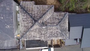 ドローンでの調査も行います。弊社ではドローン調査も無料で行っており、傷んだ屋根に負荷をかけることなく調査可能です。