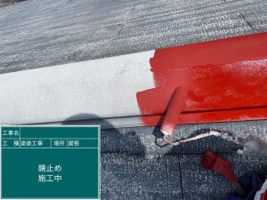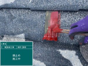 雪止め用の金具や棟板金カバーにしっかりと錆止めを塗布していきます。