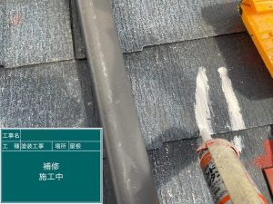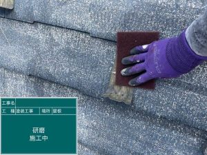 鉄部のケレン作業や、ひび割れた屋根材の補修を行います。